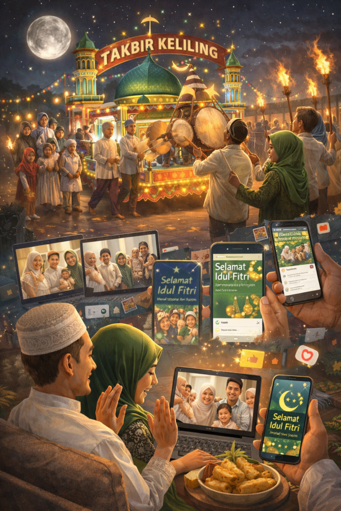 Takbir keliling tetap berlangsung, silaturahmi langsung tetap dilakukan, namun teknologi hadir sebagai pelengkap yang mempermudah dan memperluas makna kebersamaan.